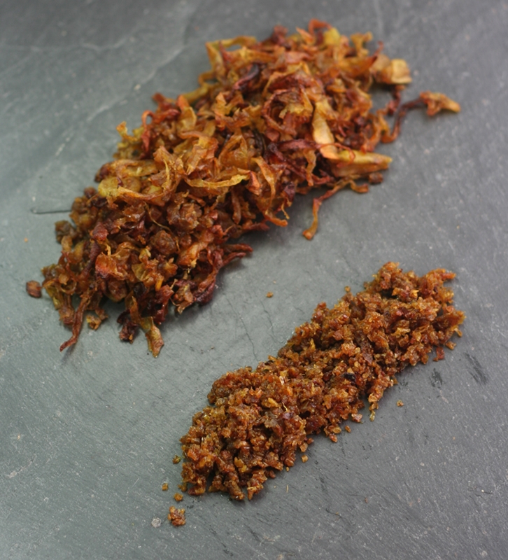 Originating in the French-influenced southern Indian state of Puducherry, Vadouvan is an onion-based spice mix used for flavouring a wide range of dishes. Also called French Masala and vadagam, it consists of a mixture of caramelised finely chopped shallots, onions and garlic, together with aromatic ground spices, slowly dried in the oven until it resembles a dark, moist crumble. I prefer to dry mine a little longer than most recipes recommend, because once cooled, I can then grind it to a moist powder in the spice grinder and then keep it handy in the spice drawer. The photograph shows Vadouvan as it ends up, and also after it has been ground. There was a flurry of excitement about Vadouvan a few years ago, as it was used by one of the contestants in the US series Top Chef to great effect, but that seems to have died down and I was reminded of it just the other day and thought it deserved some renewed interest.