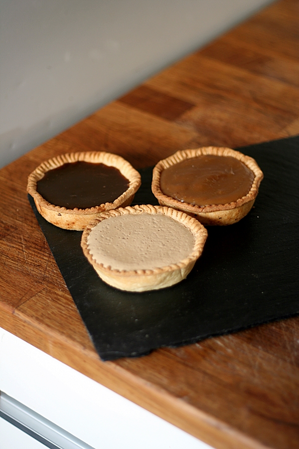 The fillings are very much variations on a theme of dark muscovado sugar and I’m really pleased with the three differing flavours that resulted. The Butterscotch is really dark and very much a ‘grown-up’ flavour – you could even add a slosh of real scotch to ramp it up to dinner-party level. The Toffee is very child-friendly in flavour – almost mild – and a real comfort food. The Gypsy Tart is a 2-ingredient classic that harks back to memories of school dinners. There are many recipes for the filling ‘out there’, most of which generally have too high a proportion of sugar and too much milk, resulting in gigantic pies of tooth-aching sweetness. This version makes for a light and frothy filling with just the right balance of flavour and sweetness. It is the only one of the three that needs any further cooking once poured into the pre-baked pastry shell, but at just 20 minutes in a cool oven, these too are ready in a flash.