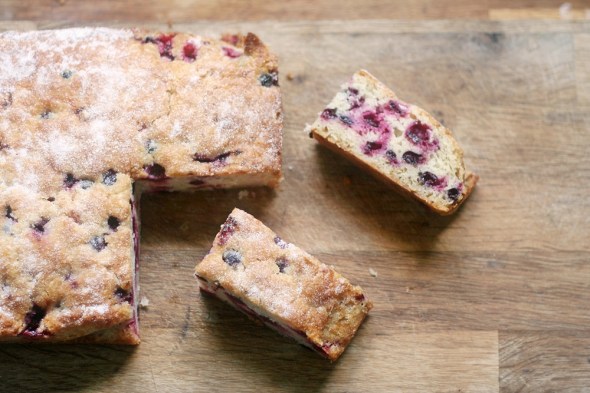The fruit makes this cake lovely and moist, and the sweetness of the cake itself contrasts deliciously with the sharp bursts of flavour from the berries. Due to the high levels  of moisture, it is not a cake that should be baked in a deep tin, as this runs the risk of being undercooked and having soggyness in the middle. A relatively shallow square tin, or traybake is ideal.