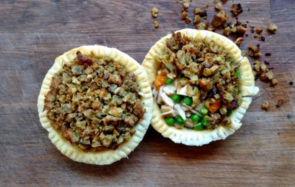 All the flavour of Sunday Roast Chicken – inna pie! Using the leftover vegetables and gravy means it comes together in minutes and the crunchy stuffing ‘crumble’ sets it off beautifully. Can be made without pastry as a ‘bake.’