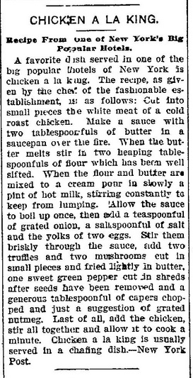 Recipe for Chicken a la King, Massillon Independent newspaper, December 24, 1906, p2