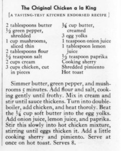There’s conflicting stories as to where it originated, but if you read around, the most often cited is that it was created at the Brighton Beach Hotel in Brooklyn, New York at the end of the nineteenth century (1898) by chef George Greenwald for his boss E. Clarke King II. It really was a rich and elegant dish. Clark King’s son, E. Clark King III, published his account of the creation of the famous dish in Better Homes and Gardens in April 1937 (pp 86 & 154), together with the original recipe, reproduced below: a rich dish of chicken, peppers and mushrooms in a thickened cream sauce, served with pimientos over toast.