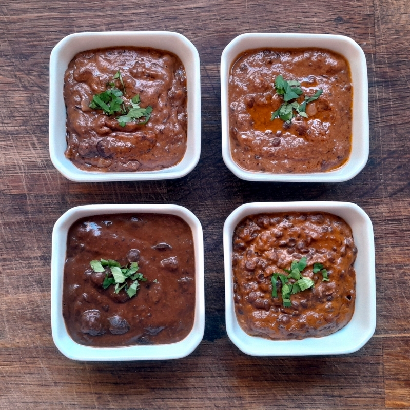 Initially, I was surprised to find that she uses black beans (and some kidney beans) in her recipe, because in my experience dal was made with lentils, but I went with the flow and have been making it with black beans ever since. Lately (as in, the last decade) I’ve been hearing buzz ‘on the socials’ about the black dal served at Dishoom. Now, although I love Ms Sahni’s dal very much, I am always open to a new take on an old favourite, and since you can’t really compare one recipe to another without having a side-by-side comparison, I opted to make Dishoom’s recipe as well. I recently acquired some black lentils[1] and decided to see how each recipe fared using them, so whipped up a batch of each (yes – four batches of black dal. But be not alarmed, it freezes well) with both black beans and black lentils, to see if there was any major differences, and whether or not I liked one over the other.