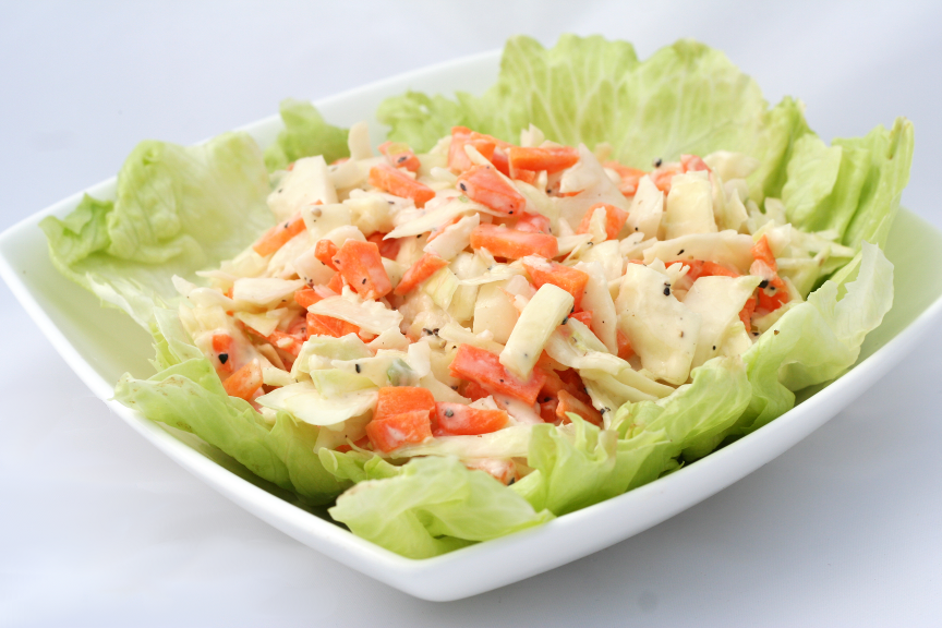 This is the coleslaw I like, for a number of reasons: it’s got crunch, its got seasoning, its got a creamy dressing and its simple to make. It also stays crisp in the fridge for 3-4 days, so well worth the effort of making. Now you might be thinking “Effort? What effort? Chop it all in the food processor, surely??” – and certainly that is one way to go, but not for me. If you like your coleslaw with a really fine consistency and you’re going to eat it immediately, then it does make sense, however I find that, after a few hours, vegetables shredded in a food processor lose their crunch and the juices from the vegetables make it all in all rather too soggy. Slicing with a knife is a little time consuming, but for 3 days worth of crunchy coleslaw, its not bad at all.