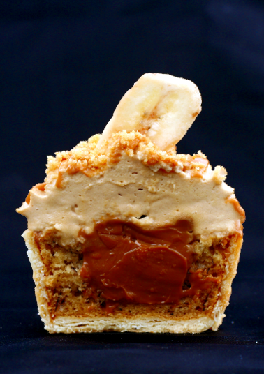 I’ve been messing about with the idea of making this classic dessert into a cupcake for quite some time, and there have been several versions along the way. This version is the one I’m most happy with: it’s faithful to the original, yet serves up all the flavours in cupcake size. A light and fluffy banana cake mixture is baked in a shortcrust pastry case, filled with caramel and topped with an unsweetened coffee-flavoured cream – the pastry and the coffee cream help offset the sweetness of the cake and the caramel. Delish!