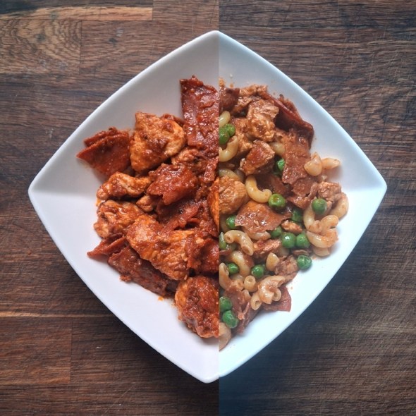 The combination of just three ingredients makes for a very flavourful meal, and one which can be brought together in no time. The basic mixture can be served over some of your reheated handy-dandy brown Basmati rice, or alongside some steamed broccoli/cauliflower/green beans. Alternatively, as in the picture, cook some macaroni (or other pasta) and frozen peas and stir all together for a satisfying bowl of comforting deliciousness you can eat with a spoon.